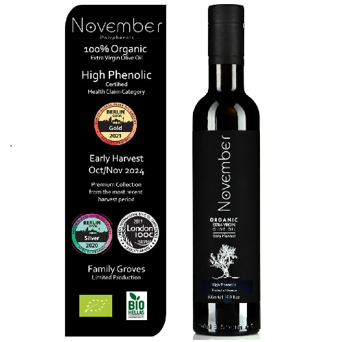 Early harvest November olive oil was hand-picked from the trees when the olives were still unripe and green, giving the olive oil it's high polyphenol count and classic peppery notes. 100% Organic and filtered to maximise shelf-life.